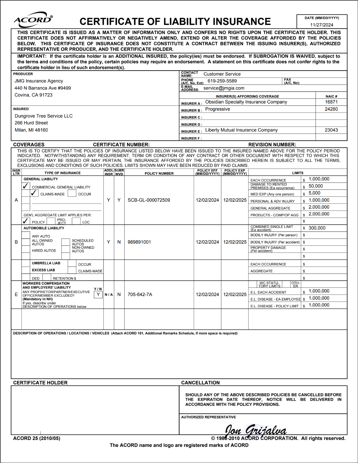 First of all, request proof of insurance from any tree service you get a quote from. If they are unwilling or unable to provide this, they are not a real company. Second, call the insurance company. It’ll take five minutes and you can verify what kinds of insurance they have, how much money can be paid out in damages, and what types of work are actually covered. Here’s ours.